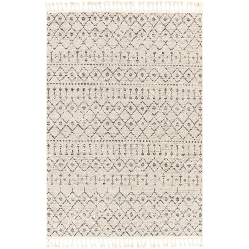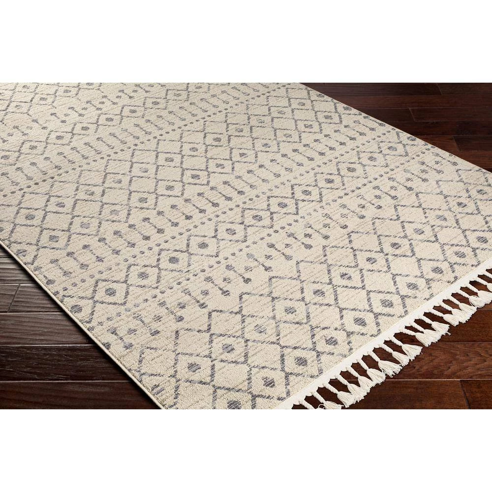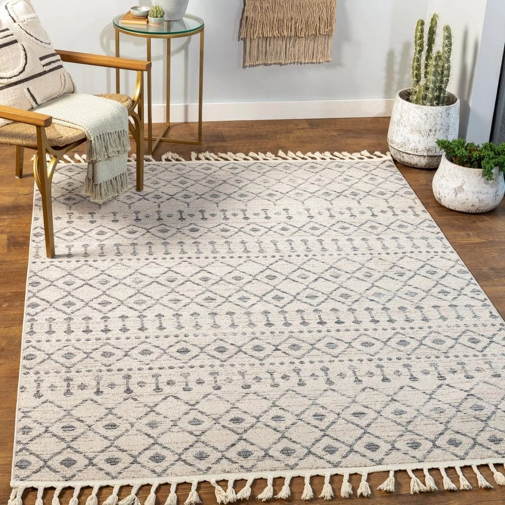 Set the stage in your space with geometric patterns and bohemian design. The neutral Euphoria rug brings cozy feels and elevated style to any room. Great for a basement entertaining space. Machine woven with 100% polypropylene in Turkey, with a medium looped pile of 0.35 in. and fringe tassels. Spot clean with a dry white cloth.